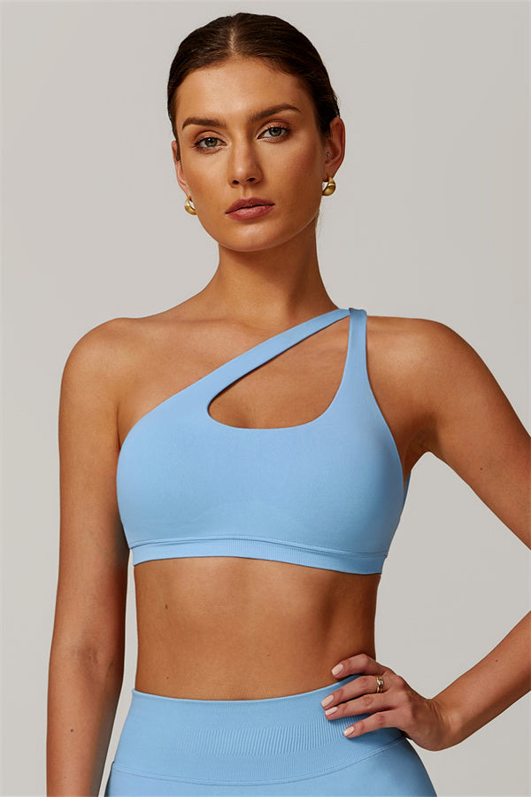 Step up your activewear game with our stunning asymmetrical cutout one-shoulder sports bra. Designed to highlight your collarbone and elongate the neck, this unique piece adds an eye-catching flair to your workout wardrobe while providing essential support.
