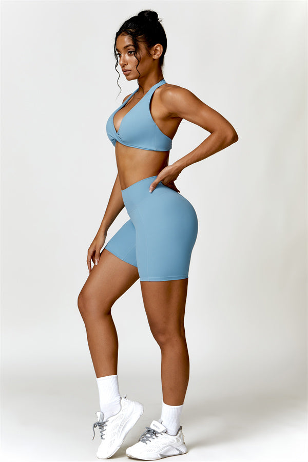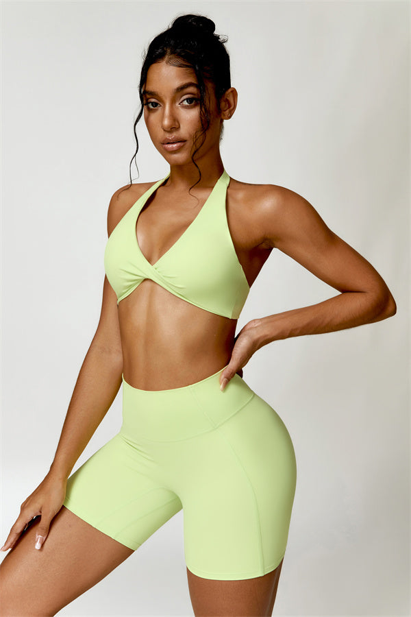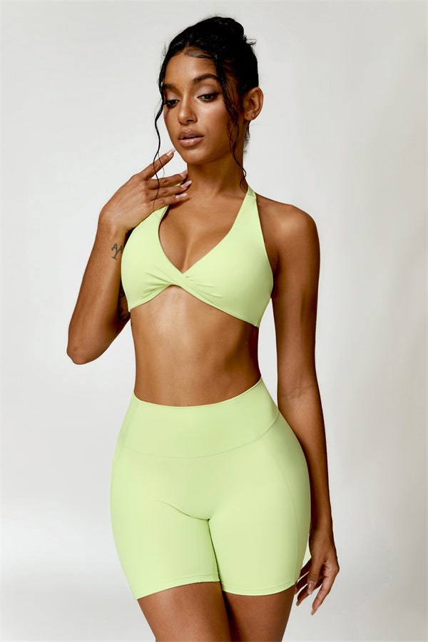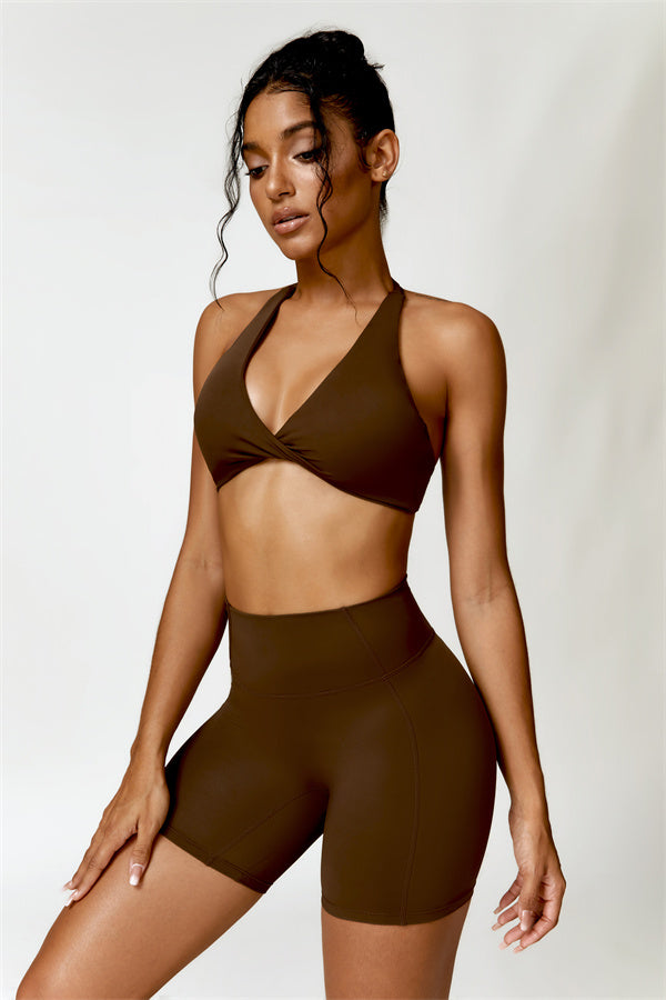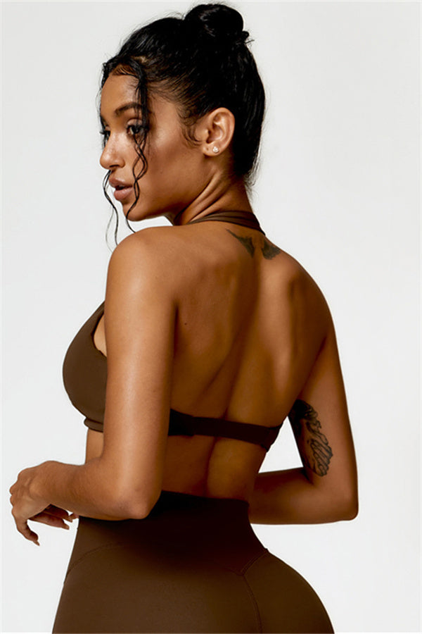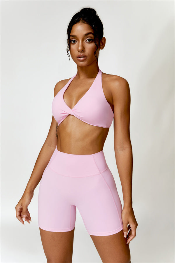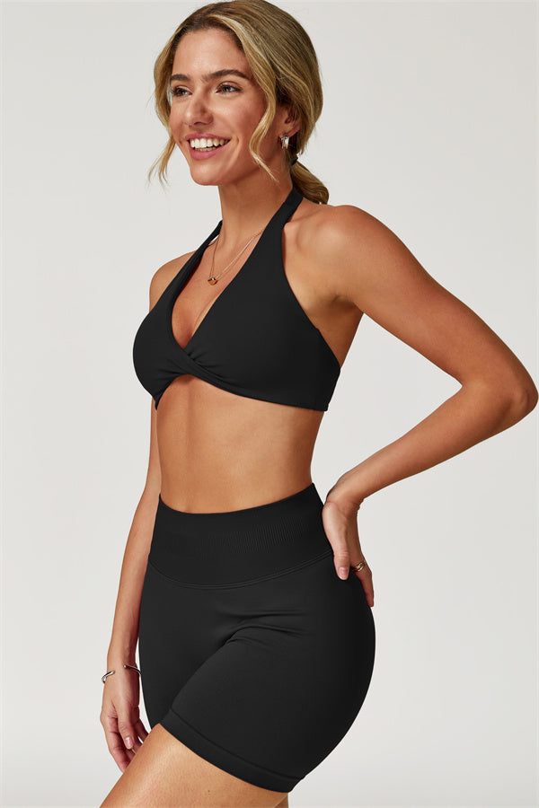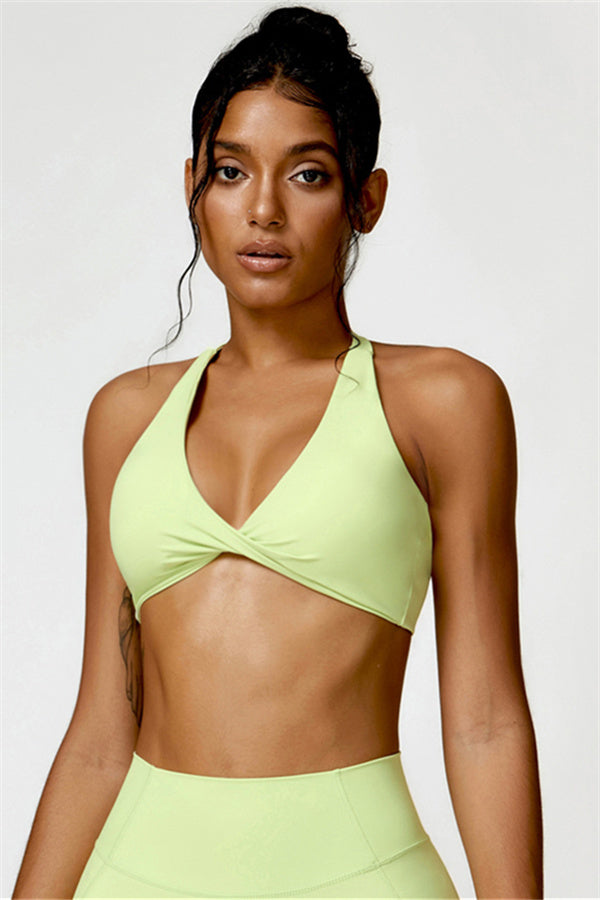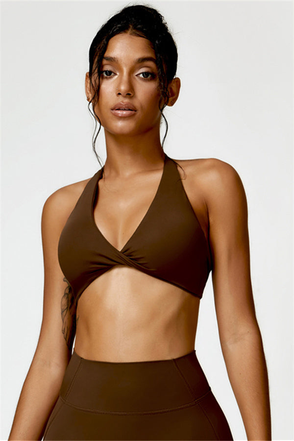 Introducing our twist-front sports bra, where sexy meets stylish. The eye-catching twisted design at the front adds a fashionable flair, while the open back beautifully showcases your shoulder blades, creating a stunning silhouette.