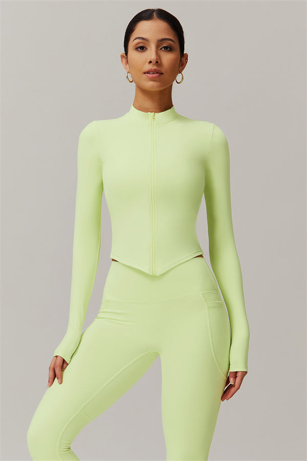 Elevate your activewear game with this sophisticated matching set, featuring a sleek jacket and figure-hugging leggings. The jacket is designed with a stand collar and full-zip closure for adjustable coverage and wind protection, adding a sporty edge to your look. Long cuffs provide slip-resistant comfort, while the V-shaped hemline contours to your body, enhancing your silhouette. Functional side pockets offer convenient storage for your essentials.