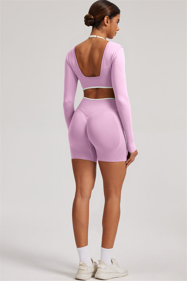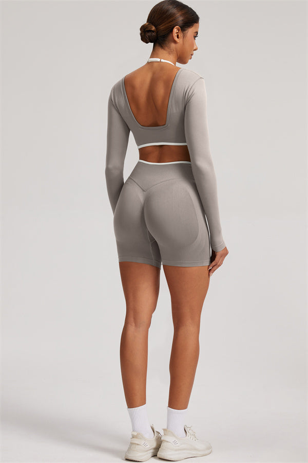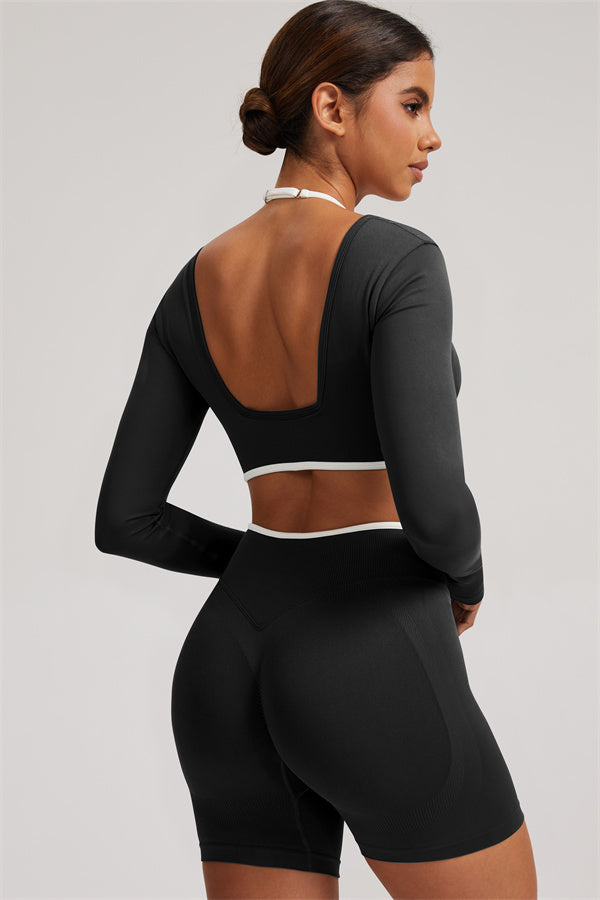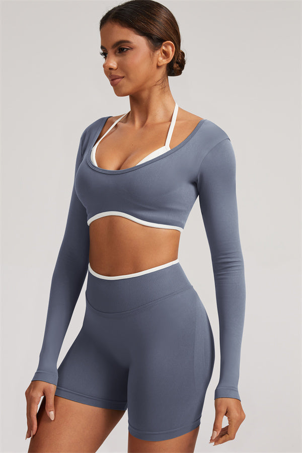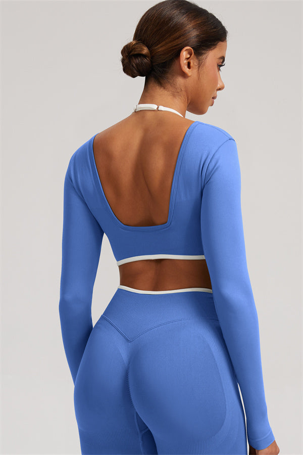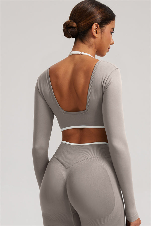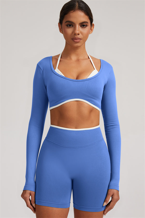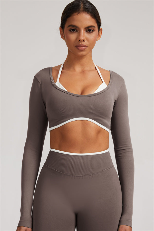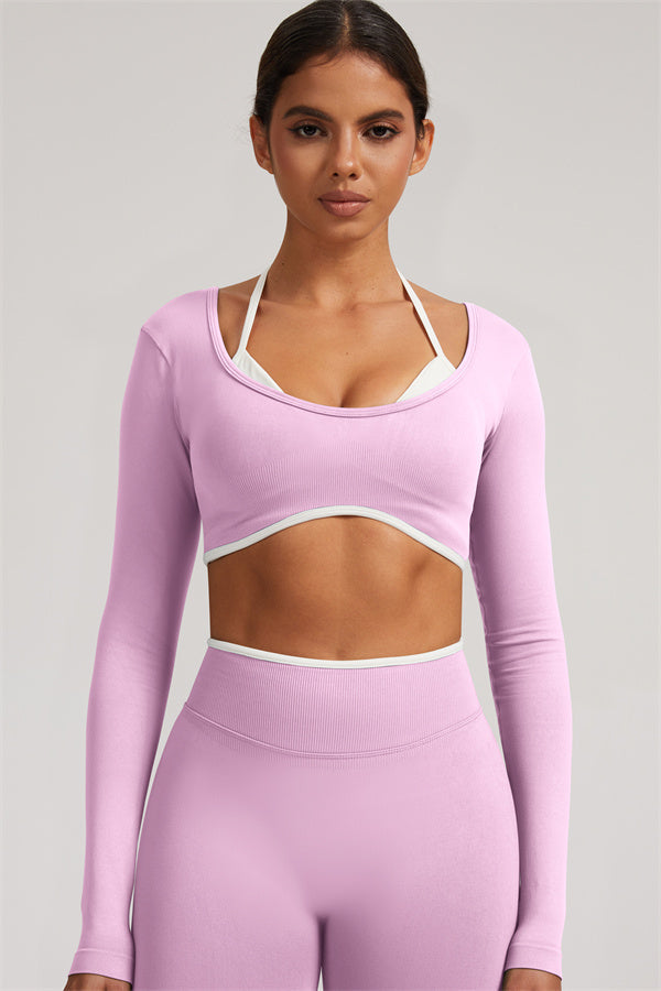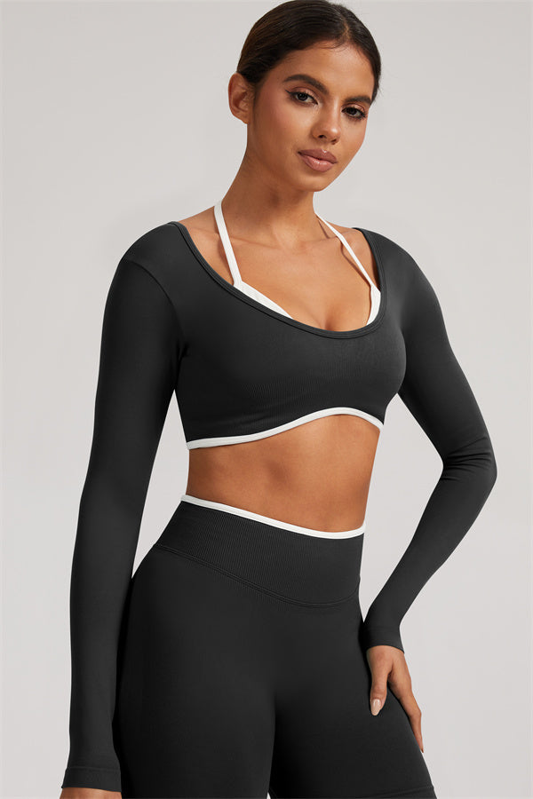 Stylish and functional, this long sleeve crop top features a layered look with contrast binding and shoulder straps, while the U-shaped back enhances your posture and highlights your back lines.