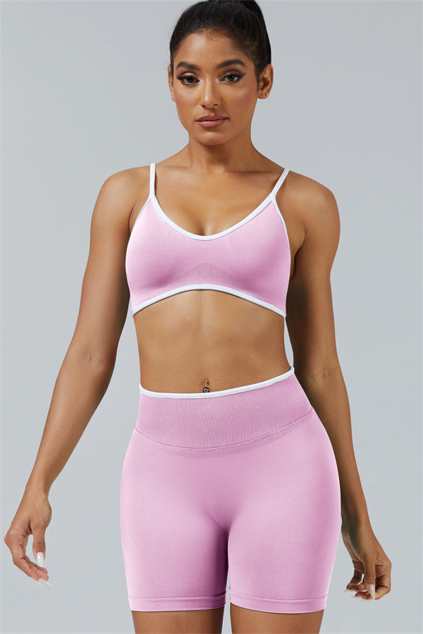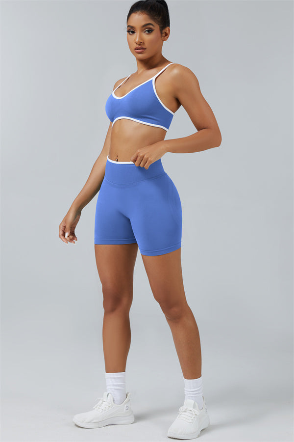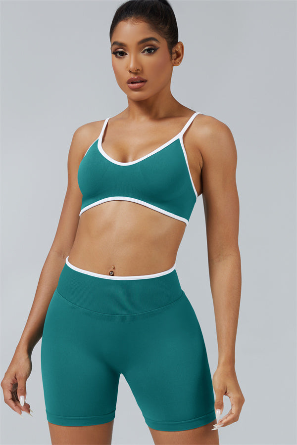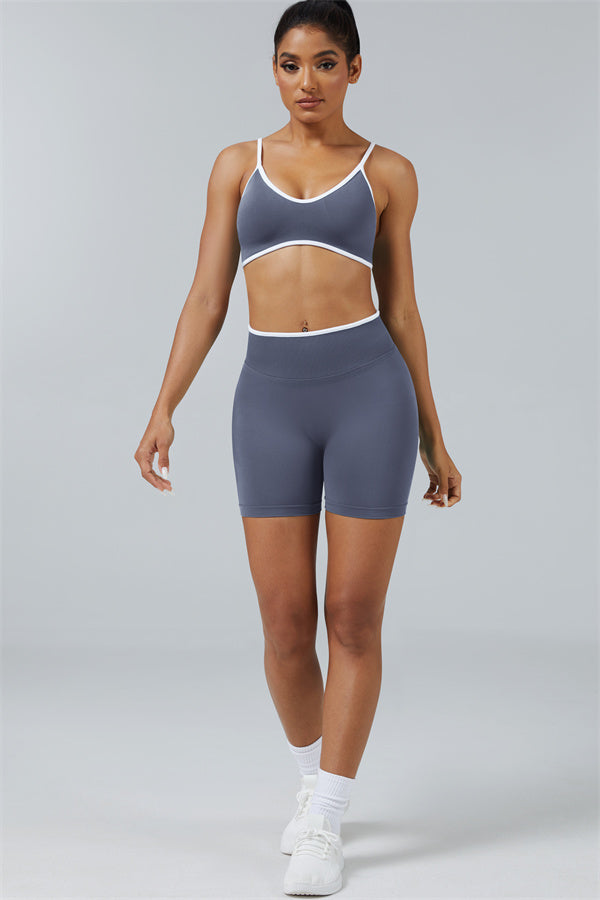 Elevate your workout style with this chic matching set, designed for both performance and fashion. The set includes a breathable sports bra and flattering shorts with sculpting details.