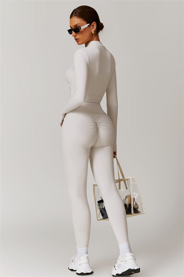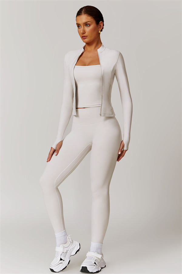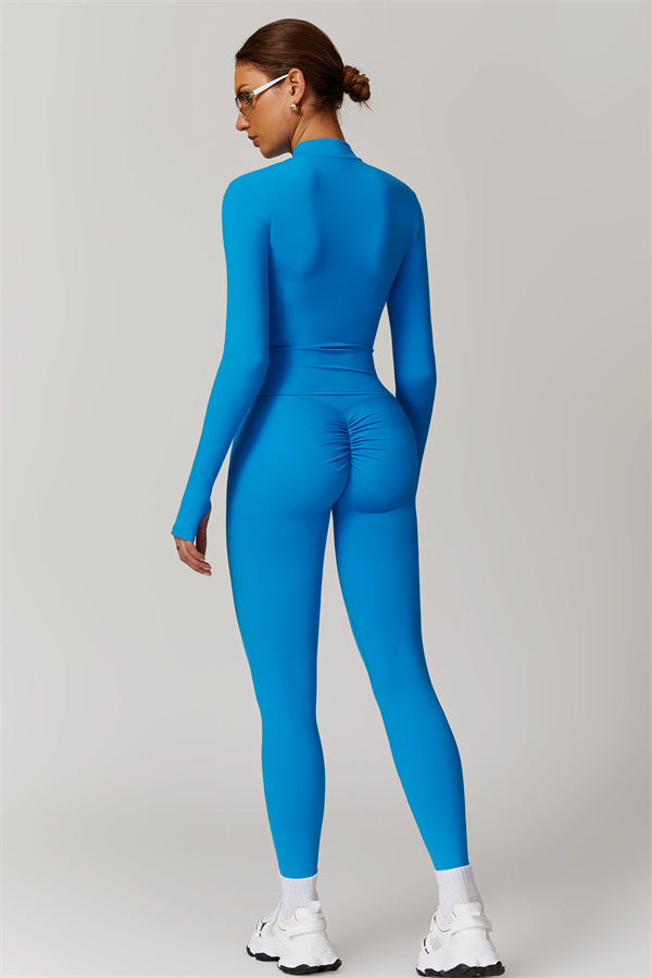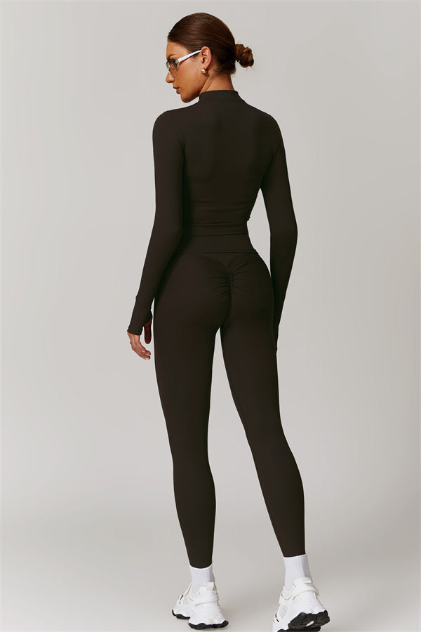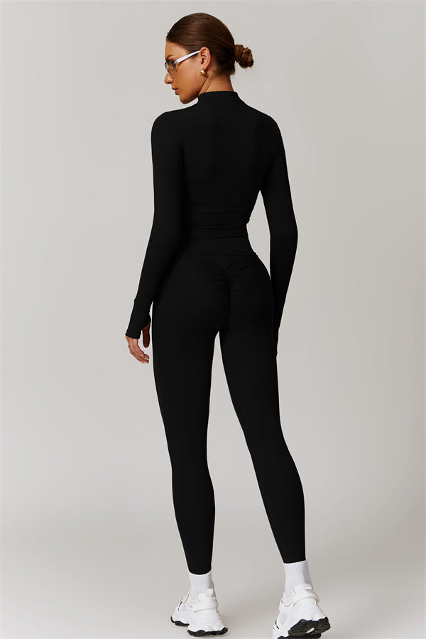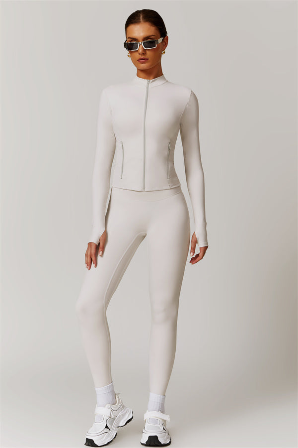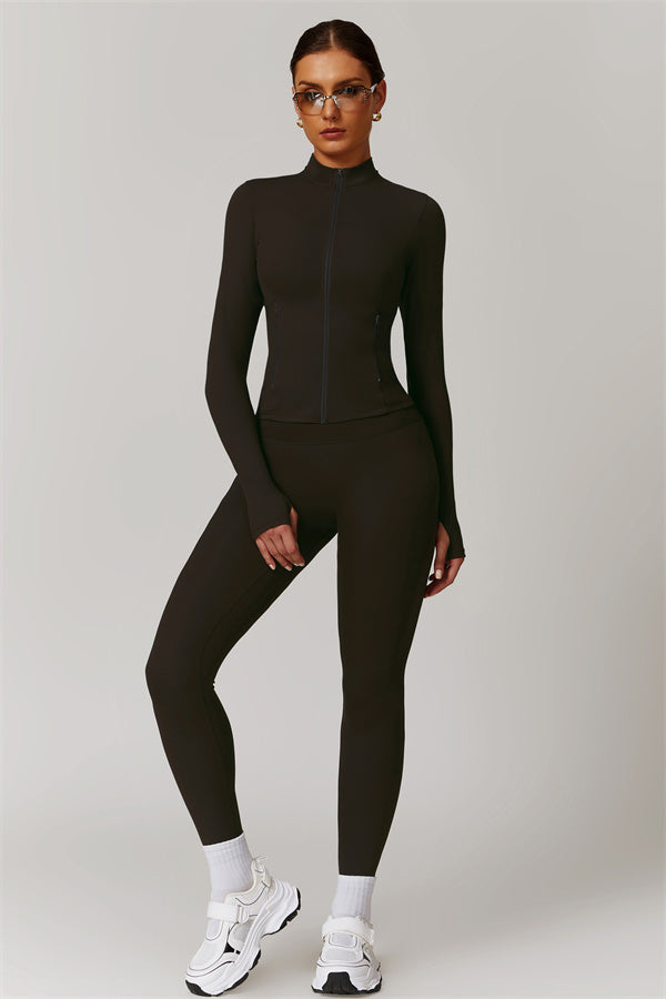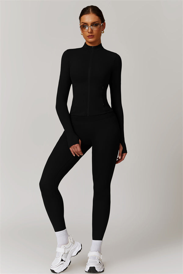 Elevate your workout wardrobe with this high-performance matching set, featuring a sleek jacket and leggings designed for both comfort and style.