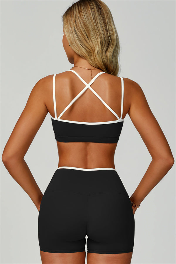 Elevate your workout in style with The Quest Set, designed for movement, support, and sculpted confidence. This matching set includes a cross-back sports bra and high-waisted shorts, crafted from our signature second-skin recycled nylon blend.