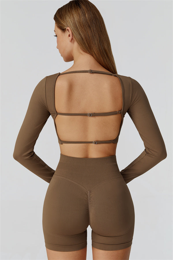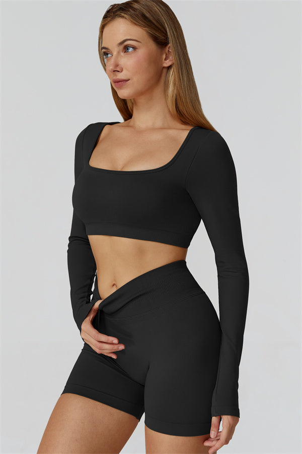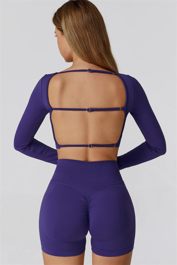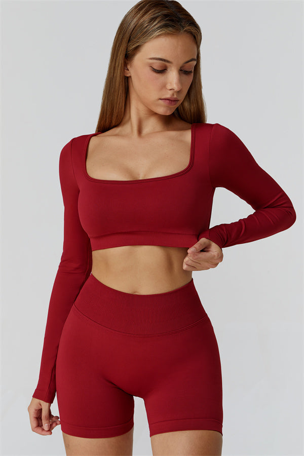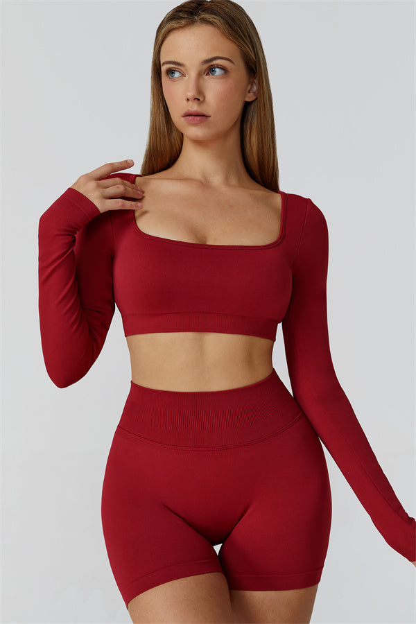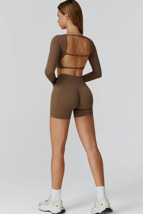 Stay cool and confident with the Reign Set, featuring a breathable, open-back long sleeve crop top and sculpting high-waisted shorts. Made from seamless, recycled knit fabric, this matching set sculpts your silhouette while offering comfort and versatile style from workout to streetwear.